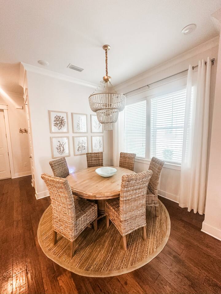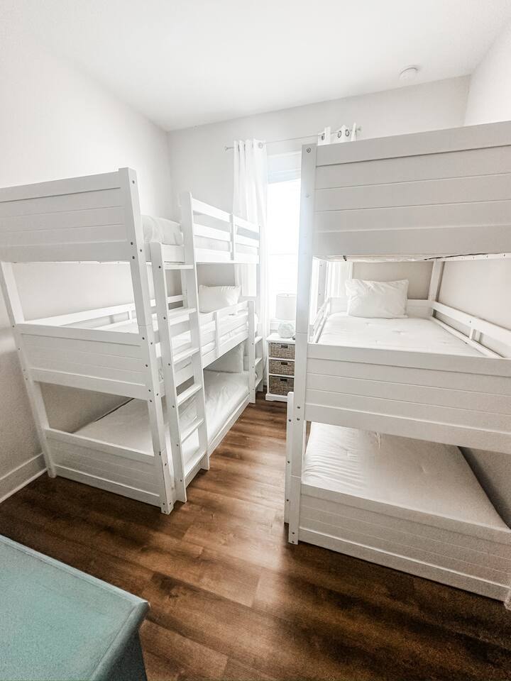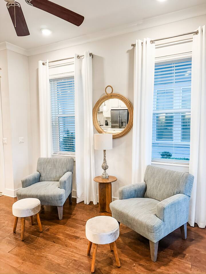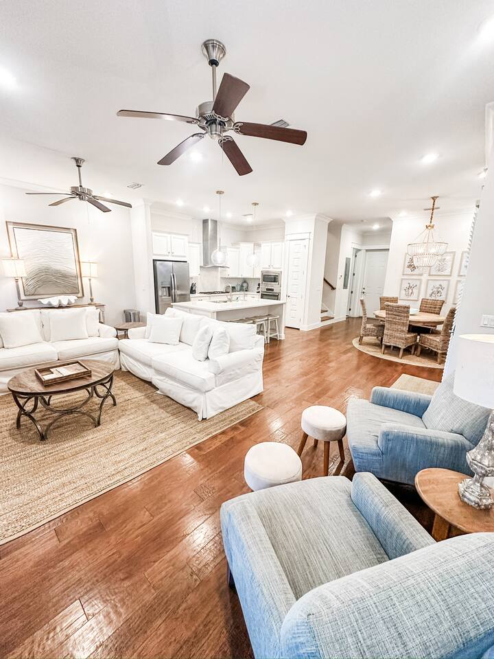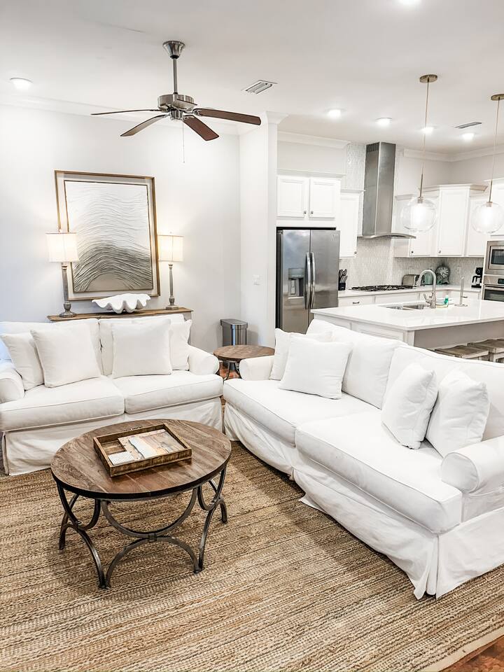 Pearl at Prominence | 30A Beach Retreat With Golf Cart, Bikes & Resort Amenities Pearl at Prominence is a cozy 1,700 sq. ft. Prominence 30A beach retreat featuring 3 bedrooms, 2.5 baths, and everything needed for a relaxing and memorable 30A getaway. Enjoy 1G high-speed WiFi, perfect for streaming, remote work, or staying connected while vacationing near The Big Chill, Seaside, Alys Beach, and Rosemary Beach. With premium finishes, a fully stocked kitchen, a private garage full of beach gear, and thoughtful family-friendly amenities, this home is designed for both comfort and adventure. A 6-seater golf cart and four bikes make exploring the best of 30A easy and fun. ⸻ KEY FEATURES High-Speed Wireless Internet Blazing-fast 1G Wi-Fi for seamless streaming, remote work, and easy connectivity. Spacious & Stylish Living Area Relax in the open-concept living room with plush seating, a sleeper sofa, and a large Smart TV with all major streaming apps. Coastal décor, natural light, and smooth flow into the dining and kitchen areas make this the perfect gathering space. Fully Equipped Kitchen Includes stainless steel appliances, granite countertops, pots, pans, standard spices, utensils, and both a Keurig and classic coffee pot. The large island is ideal for meals and conversation. Luxurious Master Suite Enjoy a calm retreat with a king bed, elegant décor, privacy blinds, and a Smart TV. The en-suite bathroom features a dual vanity, granite countertops, and a walk-in shower. Elegant Guest Bedroom The second bedroom includes a king-size bed, tufted headboard, coastal décor, a Smart TV, and a spacious closet—perfect for couples or additional guests. Fun & Kid-Friendly Bunk Room Perfect for larger families or groups, this oversized bunk room includes six twin beds, a Smart TV, books, toys, and games—an ideal hangout after a day on the beach. Laundry Room Equipped with a brand-new GE washer and dryer for added convenience. Garage With Beach Gear, Extra Fridge & Towels The private garage is stocked with everything needed for smooth beach days: • Six beach chairs • Beach umbrellas • Beach toys • Backpack cooler • 10 beach towels • Full-size additional refrigerator for extra drinks and groceries As an added bonus, the garage also features a brand new foosball table. Baby & Toddler Essentials Includes a baby gate, baby monitor, and pack ’n play for convenience during your stay. 6-Seater Golf Cart & 4 Bikes Included Cruise 30A with ease using the included golf cart and enjoy scenic rides with the four adult bikes. Safety helmets provided. Resort-Style Amenities Enjoy access to Prominence’s resort-style pools, cabanas, and grilling areas. Heated seasonally: • March 1–April 30 • October 1–November 30 • December 21–31 (Schedule subject to change) Minutes From Beach Access Reach 30A’s iconic sugar-white beaches quickly by bike, short drive, or with the golf cart. Prime 30A Location Walk to The Big Chill, and enjoy quick access to Seaside, Alys Beach, Rosemary Beach, scenic bike paths, dining, shopping, and entertainment. ⸻ Explore 30A Bike coastal trails, relax on sugar-white sands, explore boutiques and restaurants, enjoy live music, or visit state parks. Whether you’re looking for adventure or unwinding, Pearl at Prominence is your ideal home base. Book now and start making unforgettable beachside memories!
