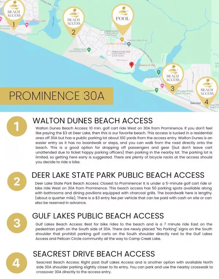 Guests have full access to the entire home and all community amenities, including two resort-style pools (Northside is heated seasonally), community grills, a vibrant town center, large green spaces, and over 20 miles of 30A bike and hiking paths. This rental also includes exclusive use of a 6-seater golf cart and all provided beach gear and toys, making your 30A beach vacation easy and enjoyable. Enjoy self-check-in with a smart lock. Your unique access code will be sent on the day of arrival. Parking: • Free parking for 3 vehicles – 1 in the garage and 2 in the driveway • Overflow parking is available in Prominence South (gravel spots on Pleasant and Clipper Streets) • No overnight parking at the pool • No trailer parking available • Bikes and golf carts must be parked in the driveway or garage Quiet hours and Prominence community rules apply to ensure a peaceful stay for all guests. These will be shared in your pre-arrival information. Enjoy full access to everything this home and Prominence 30A have to offer! Let us know if you have any questions before or during your stay.